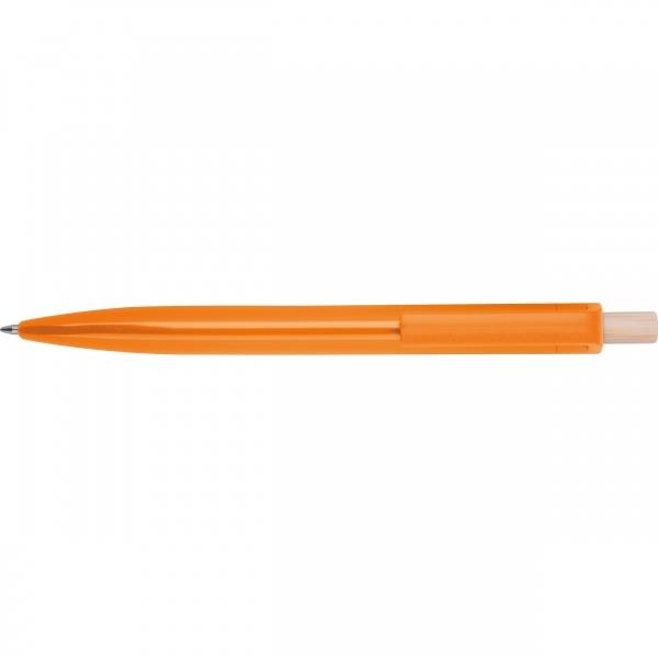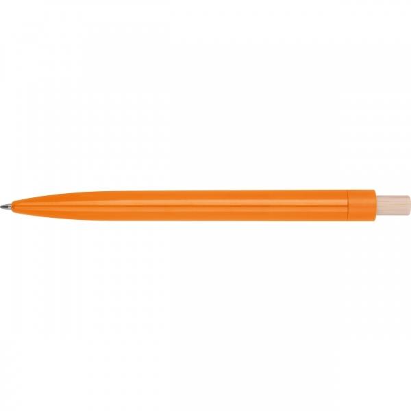 Długopis wykonany z recyklingowego ABS z bambusowym przyciskiem. Ma niebieski plastikowy wkład.