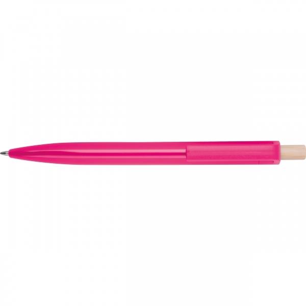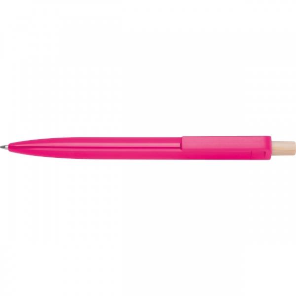 Długopis wykonany z recyklingowego ABS z bambusowym przyciskiem. Ma niebieski plastikowy wkład.