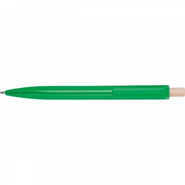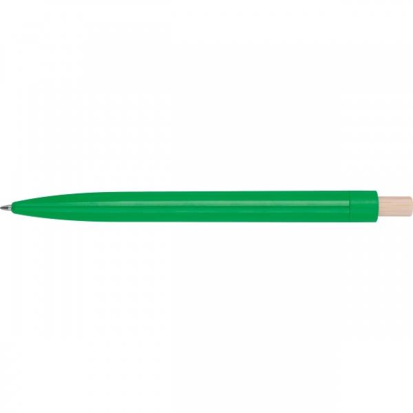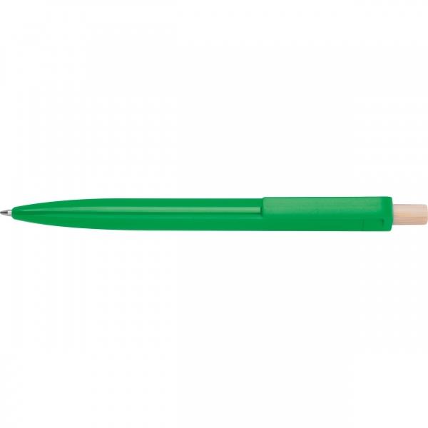 Długopis wykonany z recyklingowego ABS z bambusowym przyciskiem. Ma niebieski plastikowy wkład.