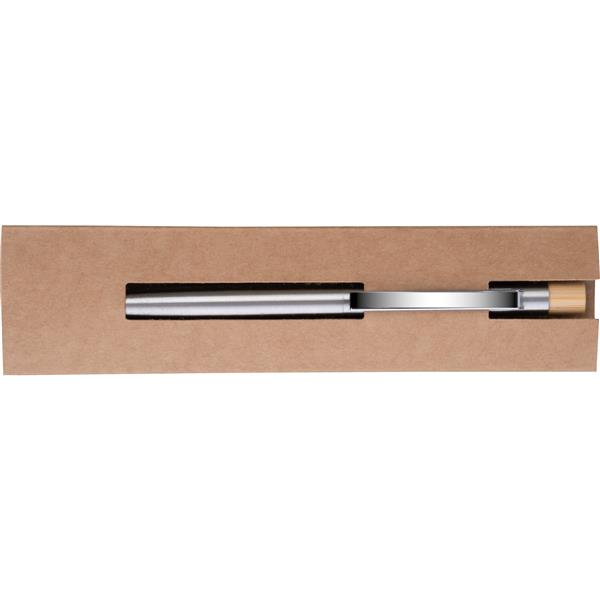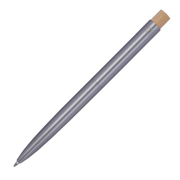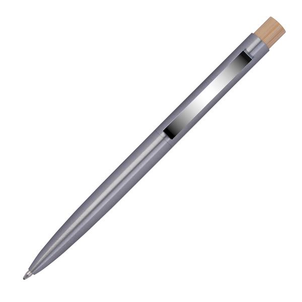Długopis wykonany ze stali nierdzewnej z recyklingu, wyposażony w przycisk z bambusa oraz wkład o dużej pojemności piszący na niebiesko.