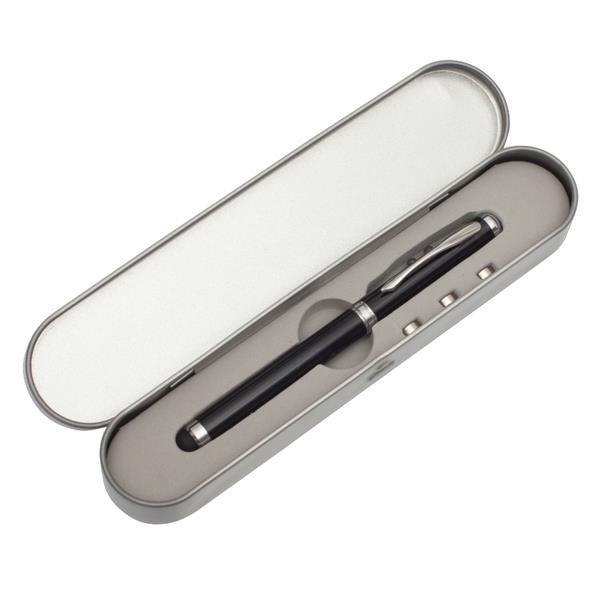 Długopis ze wskaźnikiem laserowym, latarką LED oraz końcówką przystosowaną do obsługiwania ekranów dotykowych. Dołączone baterie 3 x LR41. Pakowany w srebrne aluminiowe opakowanie upominkowe.