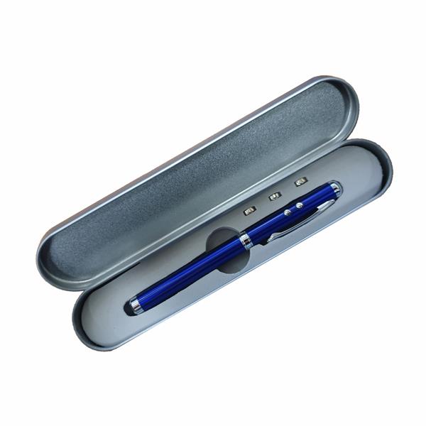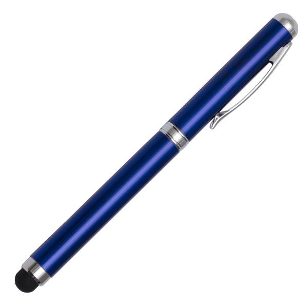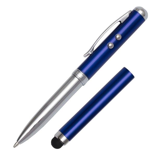 Długopis ze wskaźnikiem laserowym, latarką LED oraz końcówką przystosowaną do obsługiwania ekranów dotykowych. Dołączone baterie 3 x LR41. Pakowany w srebrne aluminiowe opakowanie upominkowe.