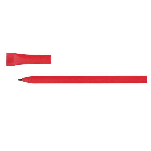 Długopis z dopasowaną kolorystycznie zatyczką, trzon z ciętym zakończeniem, wkład w niebieskim kolorze, produkt wykonany ze zrolowanego papieru