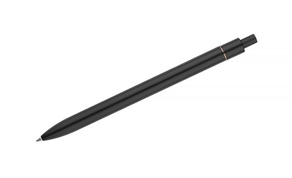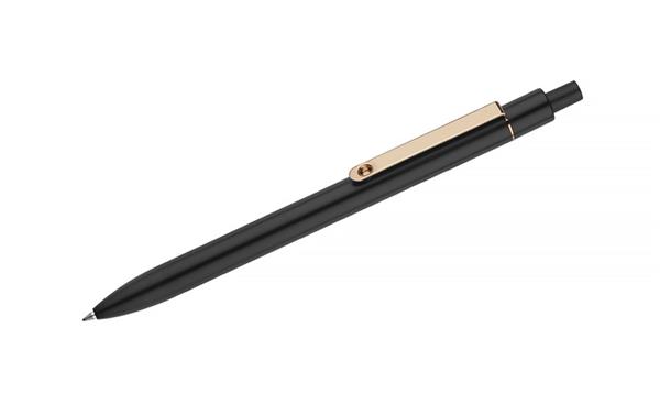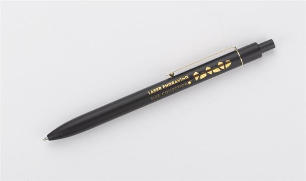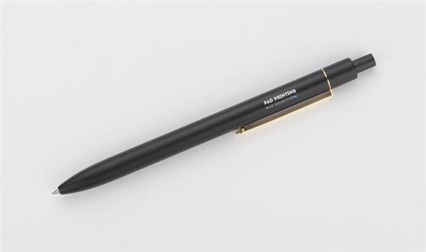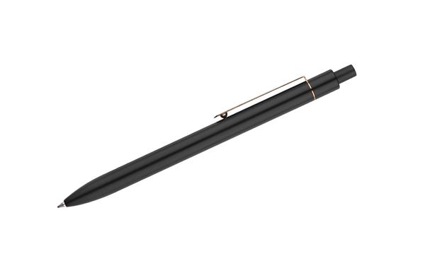 Stylowy długopis aluminiowy z matowym wykończeniem i klipem w kolorze złotym.