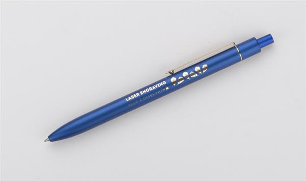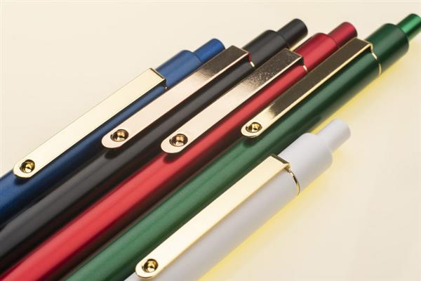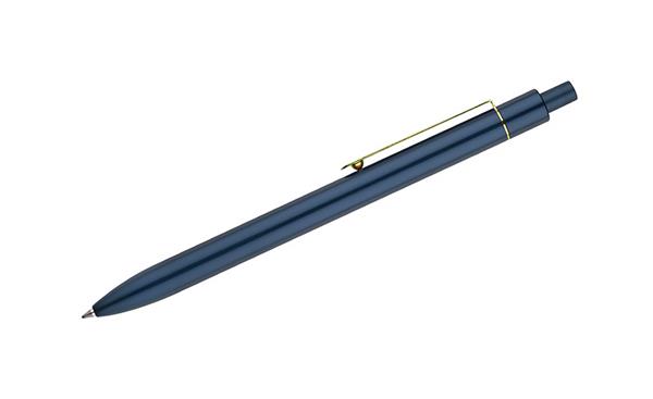 Stylowy długopis aluminiowy z matowym wykończeniem i klipem w kolorze złotym.