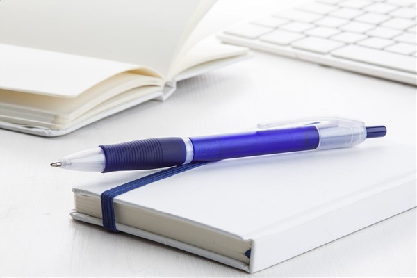 Plastikowy długopis z gumowym uchwytem. Z niebieskim wkładem.