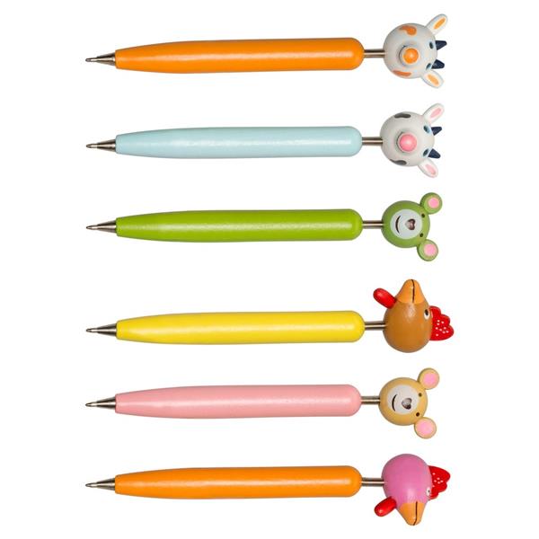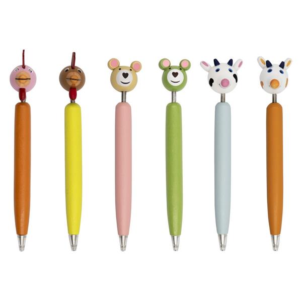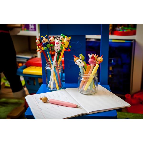 Długopis „zwierzątko” z kolorowym trzonem, występuje w 6 różnych wzorach sprzedawanych losowo, wkład w niebieskim kolorze, produkt wykonany z drewna i żelaza