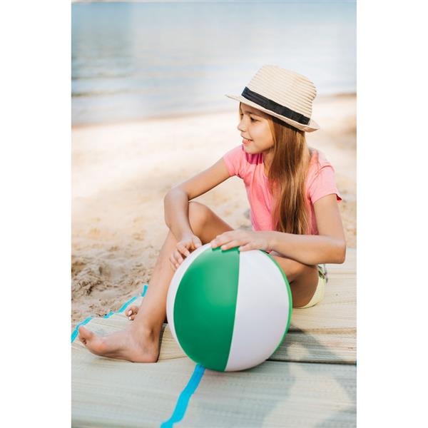 Dmuchana piłka plażowa z białymi i kolorowymi panelami, rozmiar jednego panelu: 12 x 30 cm, obwód nadmuchanej piłki: ok. 81 cm, produkt wykonany z PVC