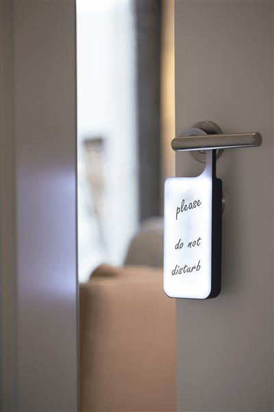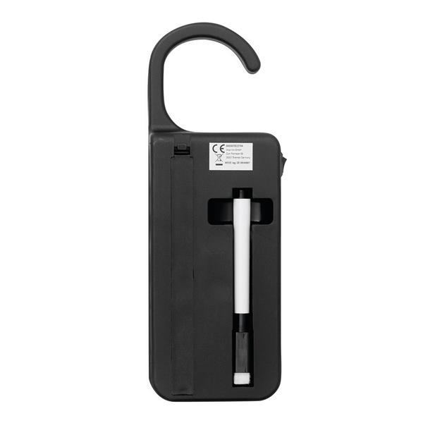 Zawieszka na drzwi DO NOT DISTURB z oświetleniową taśmą LED, do której włącznik/wyłącznik umieszczony jest z boku. Na zawieszce można zapisywać wiadomości za pomocą dołączonego zmywalnego markera z gumką do zmazywania. Zasilanie na 3 baterie AAA (nie ma w komplecie).