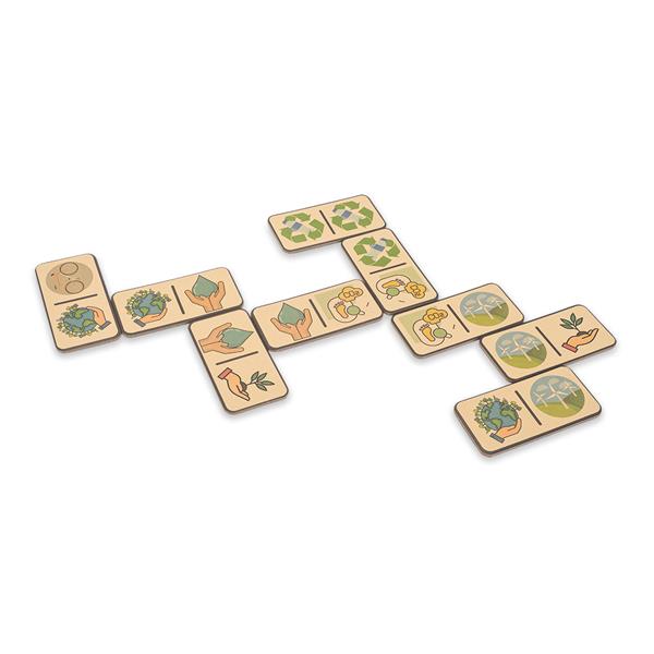 Edukacyjne domino z 28 kafelkami przedstawiającymi ekologiczne symbole, takie jak recykling, sadzenie drzew czy ochrona Ziemi. Gra uczy przez zabawę, rozwija świadomość ekologiczną, logiczne myślenie. Wykonana z trwałego kartonu, pakowane w tekturowe pudełko.