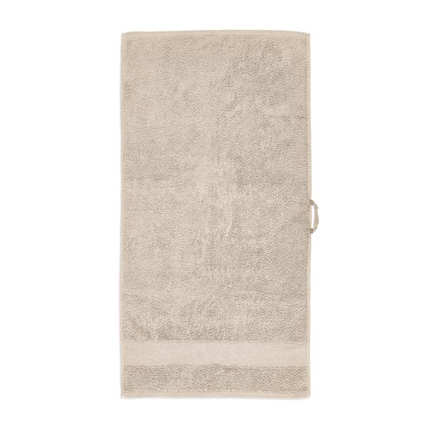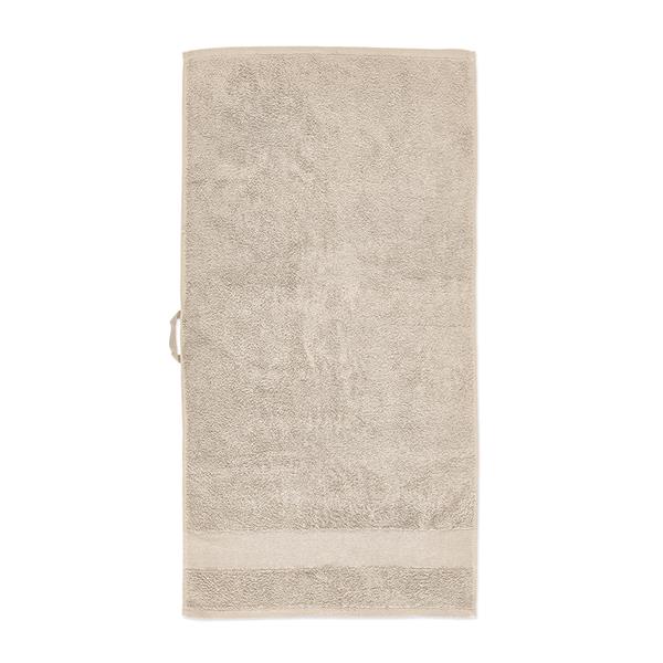 Nasz wyprodukowany w Portugalii ręcznik frotte, wykonany z bawełny pochodzącej z recyklingu (60% bawełny z recyklingu i 40% bawełny), podnosi jakość pielęgnacji. Jego gramatura wynosi 370 g/m2. Ręcznik ma wymiary 50 x 100 cm, nadrukowany pasek i bawełniany wieszak. Zapakowany w biodegradowalną torebkę foliową.