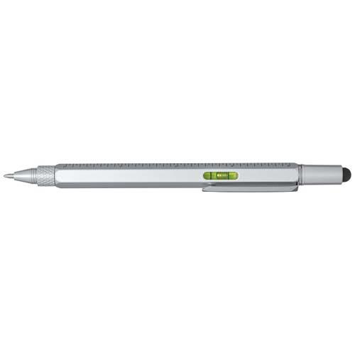 Dora aluminiowy wielofunkcyjny długopis wykonany częściowo z materiałów pochodzących z recyklingu, wyposażony w dwustronną linijkę, dźwignię, śrubokręt, podziałkę i czarny rysik wykonany z gumy. Korpus został wykonany z aluminium pochodzącego z recyklingu i pokryty srebrną powłoką natryskową. Klips wykonany jest z żelaza. Śrubokręt jest wykonany ze stali. Górna część i końcówka są wykonane z RABS. Kolor tuszu: Czarny. Żywotność: 400 metrów. Rozmiar stalówki: 1,0 mm.