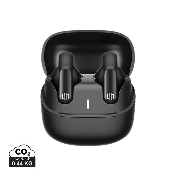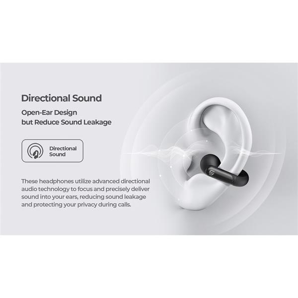 Słuchawki bezprzewodowe o otwartej konstrukcji, nie wkładane do ucha lecz mocowane na uchu, możliwość jednoczesnego słuchania muzyki i dźwięków otoczenia, czas pracy na baterii: 6,5 godziny dla słuchawek i 20 godzin z etui, funkcja ENC dla krystalicznie czystej jakości rozmów, wodoodporność IPX4, wykonane z recyklingowanego ABS z certyfikatem RCS, zawartość materiałów z recyklingu: 55%, opakowanie ograniczające użycie plastiku, wolne od PVC