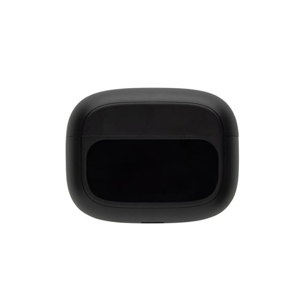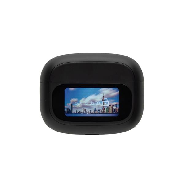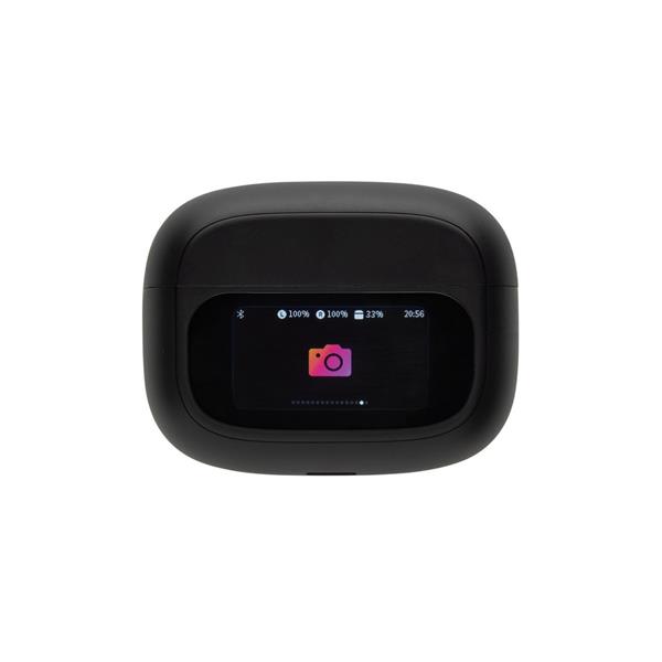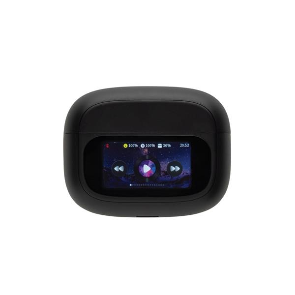 Bezprzewodowe słuchawki douszne z systemem aktywnej redukcji szumów (ANC), poziom redukcji szumów do 23 dB, BT 5.3, posiadają wbudowany ekran dotykowy TFT, który oferuje funkcje takie jak: przełączanie utworów, odbieranie połączeń, regulacja poziomu głośności i wiele innych, wodoodporne IPX4, wbudowany mikrofon, funkcja odbierania połączeń, do 6 godzin odtwarzania na jednym ładowaniu, ponowne naładowanie w etui ładującym w 1,5h, wykonane z ABS z recyklingu z certyfikatem RCS, w komplecie 3 pary nakładek w różnych rozmiarach, całkowita zawartość materiałów z recyklingu obliczona na podstawie wagi całkowitej przedmiotu: 43%, w pudełku z papieru kraftowego z certyfikatem FSC®
