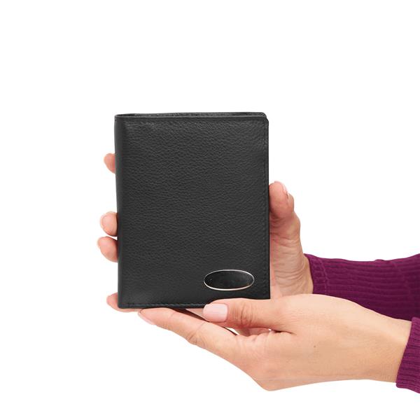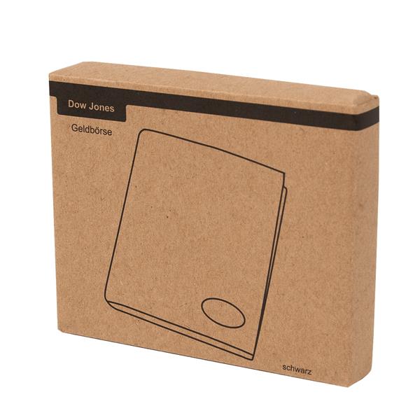 Oryginalny skórzany portfel DOW JONES z wsuwanymi kieszeniami na karty, jedną siatkową kieszenią na dowód osobisty, dwiema dużymi kieszeniami na banknoty, jedną kieszenią z zatrzaskiem na monety i z owalną metalową płytką na logo.