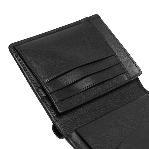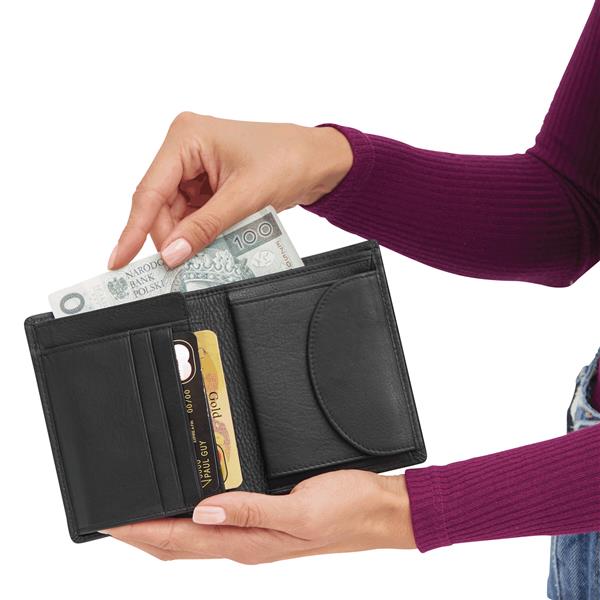 Oryginalny skórzany portfel DOW JONES z wsuwanymi kieszeniami na karty, jedną siatkową kieszenią na dowód osobisty, dwiema dużymi kieszeniami na banknoty, jedną kieszenią z zatrzaskiem na monety i z owalną metalową płytką na logo. Materiał: Skóra Kolor: czarny Tagi: Portmonetki,portfele,skóra