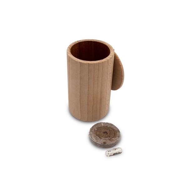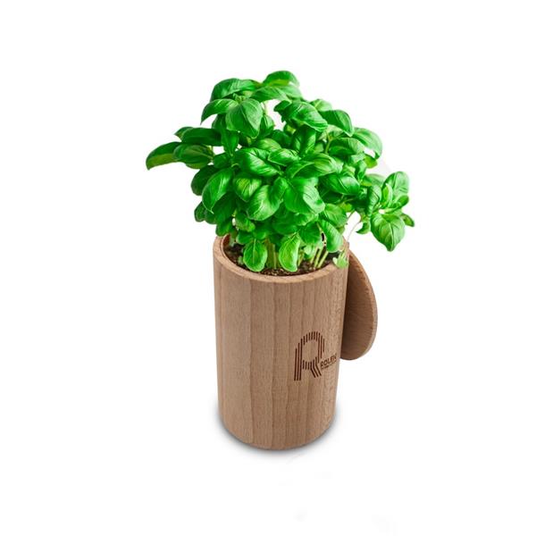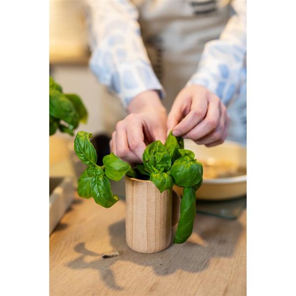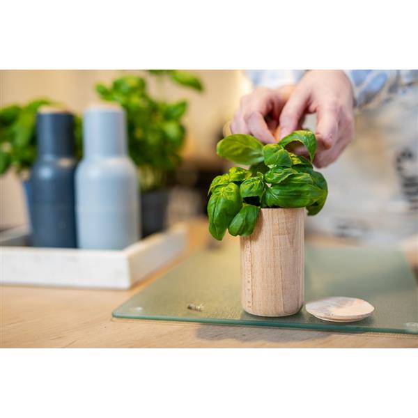 Drewniana doniczka z nasionami bazylii i podłożem torfowym w komplecie (wyprodukowana w Europie / made in Europe)