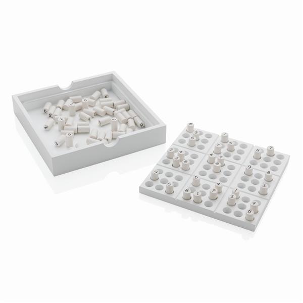 Gra Sudoku, wykonana z drewna z certyfikatem FSC® (Forest Stewardship Council), w komplecie instrukcja z zasadami oraz rozwiązania łamigłówek, ułożenie może zająć od 20 minut do 2 godzin, zależnie od doświadczenia, zapakowany w pudełko podarunkowe z certyfikatem FSC® (Forest Stewardship Council), ślad węglowy produktu: 0,55 kg CO2