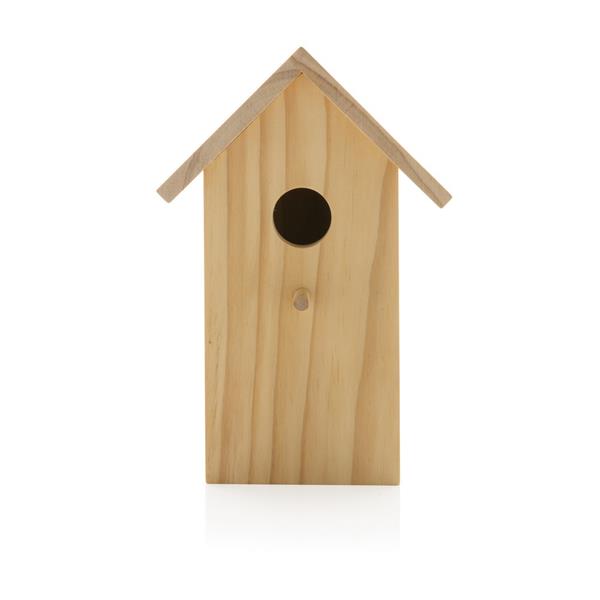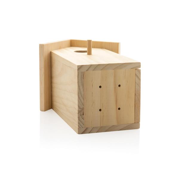 Domek dla ptaków, wykonany z drewna sosnowego z certyfikatem FSC®, otwór o średnicy 33 mm, otwierana boczna ścianka w celu łatwego czyszczenia, otwór do powieszenia na tylnej ściance, w opakowaniu z papieru kraftowego, ślad węglowy produktu: 1,09 kg CO2