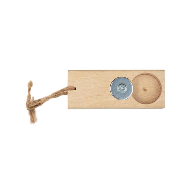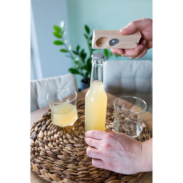 Otwieracz do butelek ze sznurkiem do łatwego zawieszania, produkt wykonany z drewna i metalu. Wyprodukowany w Europie.