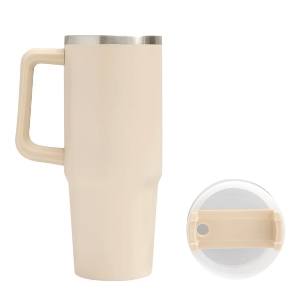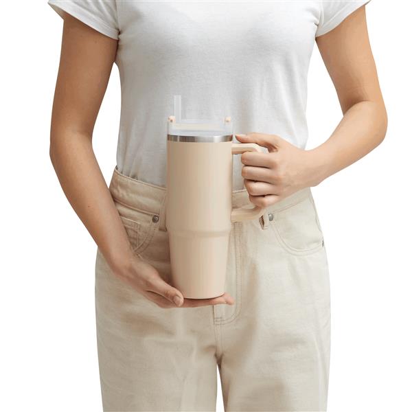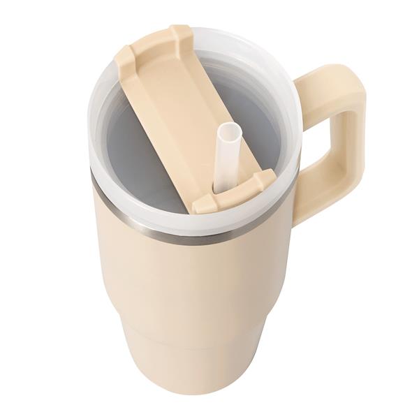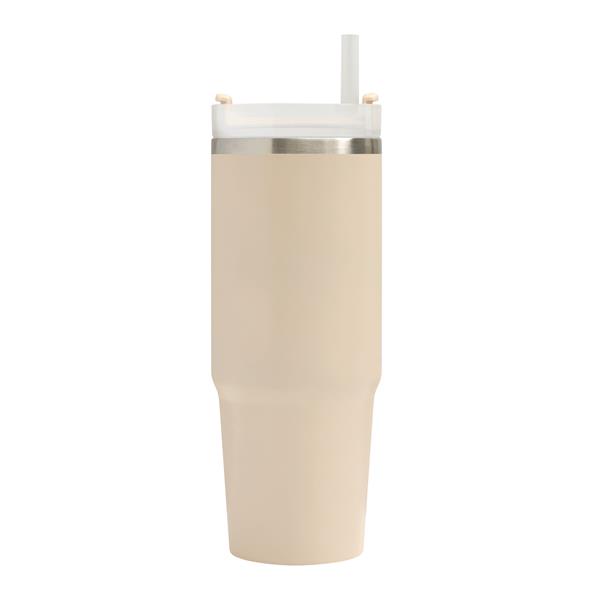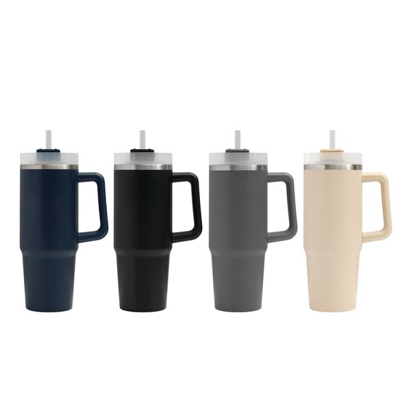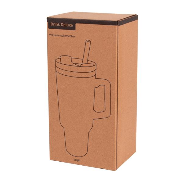Próżniowy kubek do picia DRINK DELUXE. Z podwójną izolacją – na zewnątrz i wewnątrz wykonany jest ze stali nierdzewnej. Posiada praktyczny uchwyt i szczelną, przezroczystą, plastikową pokrywkę z silikonową uszczelką. Ma zarówno wbudowany otwór do picia, jak i słomkę. Pojemność butelki to ok. 900 ml.