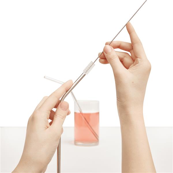 Zestaw słomek ze stali nierdzewnej DRINK HAPPY wykonany z 4 wygiętych słomek i szczoteczki do łatwego czyszczenia, w przyjaznej dla środowiska bawełnianej torbie.