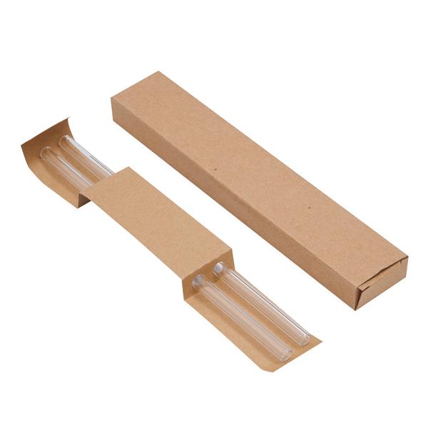 Zestaw szklanych słomek DRINK TOGETHER składający się z 2 przezroczystych słomek wielokrotnego użytku, zapakowany w pudełko.