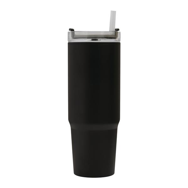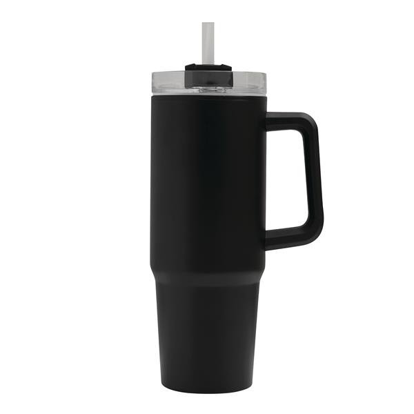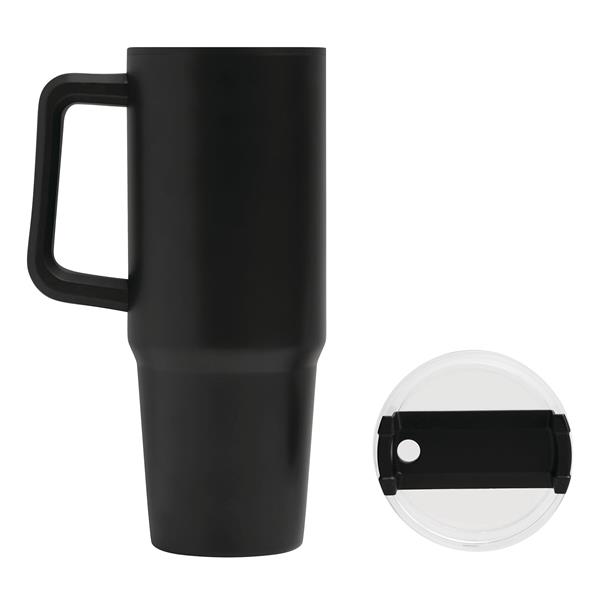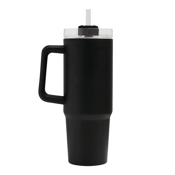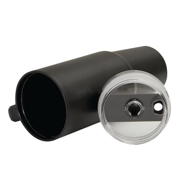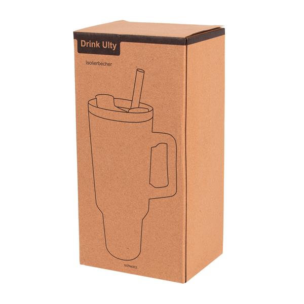Kubek do picia DRINK ULTY. Z podwójną izolacją – na zewnątrz wykonany jest ze stali nierdzewnej, a wewnątrz z tworzywa sztucznego. Posiada praktyczny uchwyt i szczelną, przezroczystą, plastikową pokrywkę z silikonową uszczelką. Ma zarówno wbudowany otwór do picia, jak i słomkę. Pojemność butelki to ok. 900 ml.