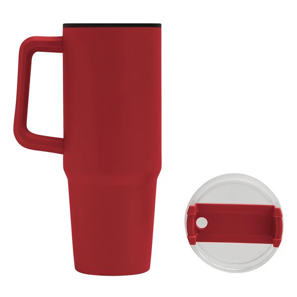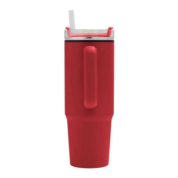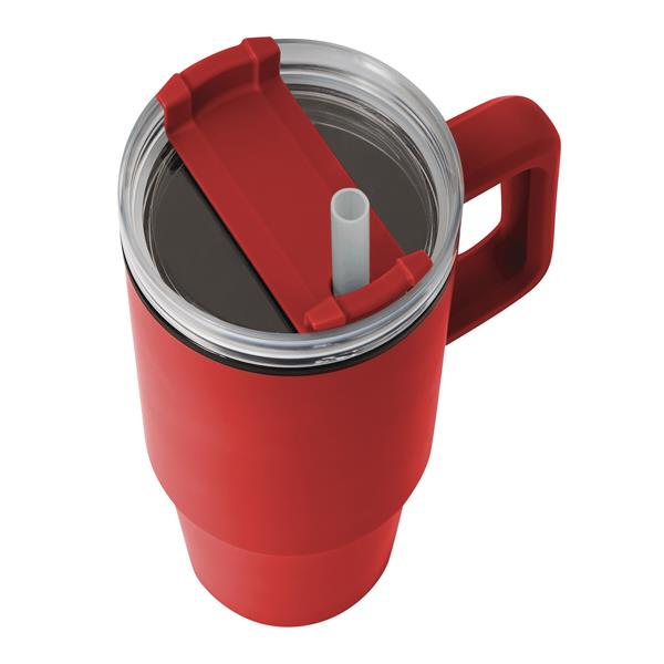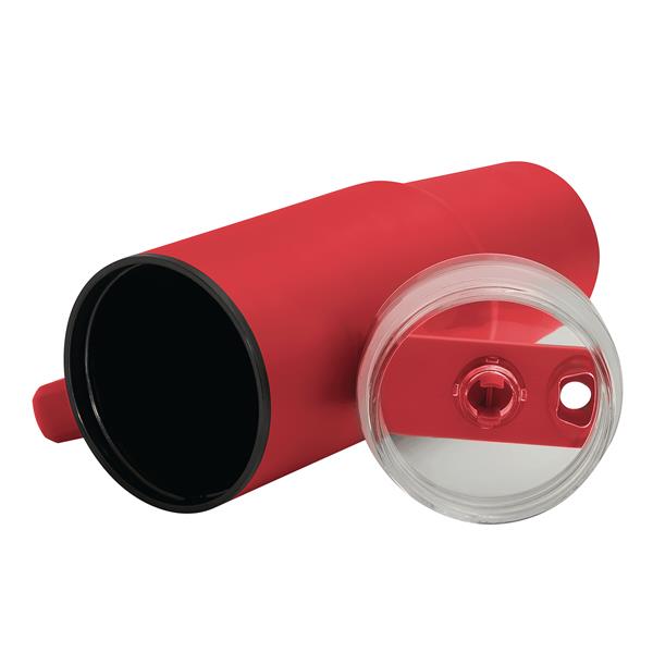 Kubek do picia DRINK ULTY. Z podwójną izolacją – na zewnątrz wykonany jest ze stali nierdzewnej, a wewnątrz z tworzywa sztucznego. Posiada praktyczny uchwyt i szczelną, przezroczystą, plastikową pokrywkę z silikonową uszczelką. Ma zarówno wbudowany otwór do picia, jak i słomkę. Pojemność butelki to ok. 900 ml.