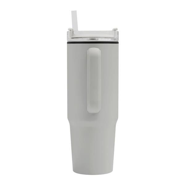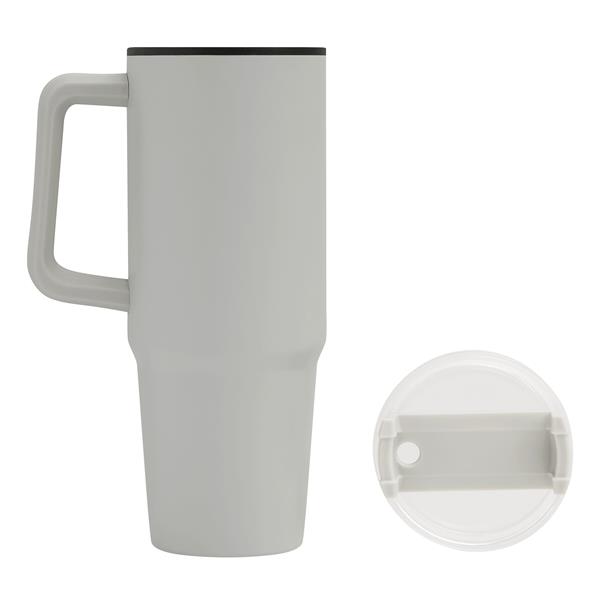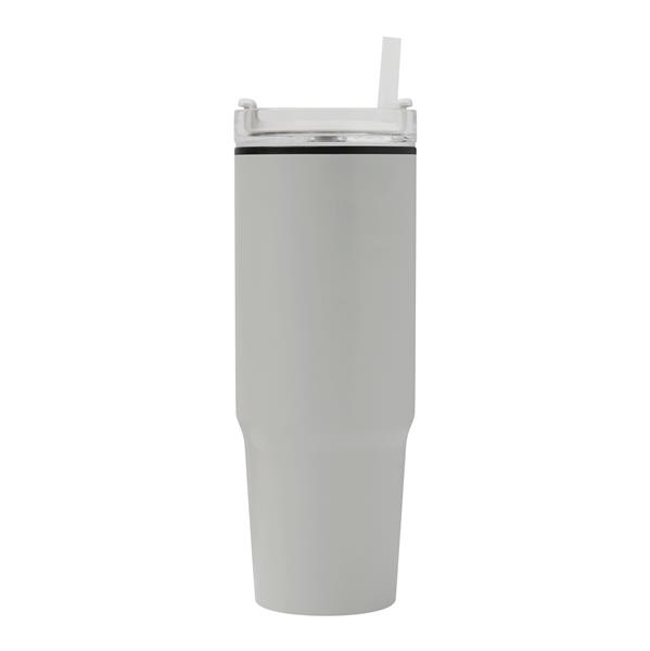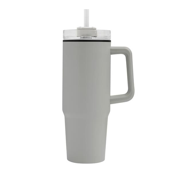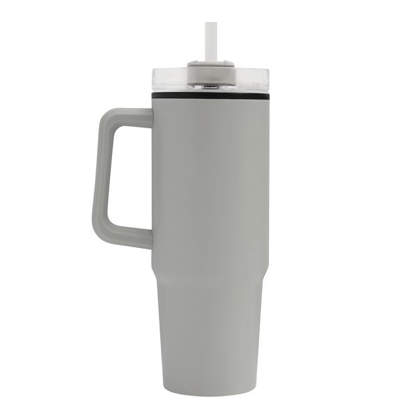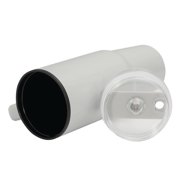 Kubek do picia DRINK ULTY. Z podwójną izolacją – na zewnątrz wykonany jest ze stali nierdzewnej, a wewnątrz z tworzywa sztucznego. Posiada praktyczny uchwyt i szczelną, przezroczystą, plastikową pokrywkę z silikonową uszczelką. Ma zarówno wbudowany otwór do picia, jak i słomkę. Pojemność butelki to ok. 900 ml.