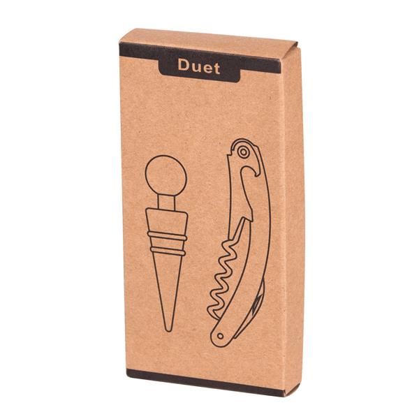 Zestaw do win DUET w czarnym pudełku z korkociągiem, otwieraczem do butelek, nożykiem i korkiem. Tagi: Otwieracze do butelek/zakrętki,naczynia barowe,naczynia do koktajli,artykuły gospodarstwa domowego,przybory kuchenne,wino i akcesoria Kolor: czarny, srebrny Materiał: Stal nierdzewna/Metal