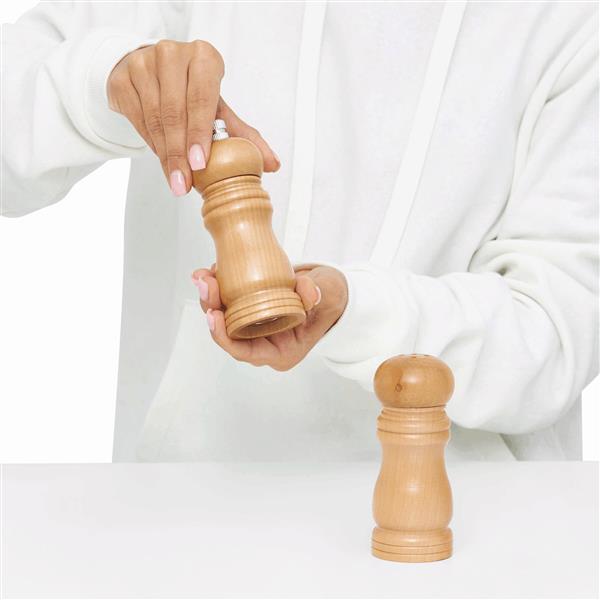 Zestaw solniczka i młynek do pieprzu DUO SPICE: wykonany z drewna, młynek do pieprzu z mechanizmem twist i ceramicznym mechanizmem mielącym, solniczka z 5 otworami do kontrolowanego dozowania