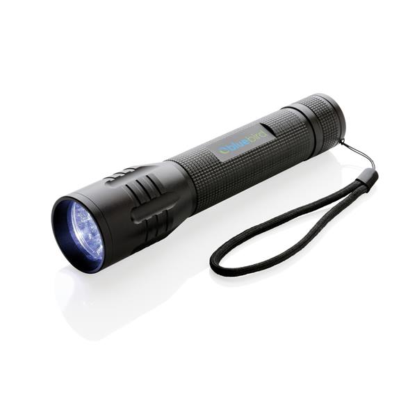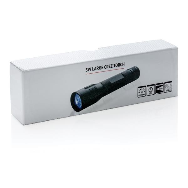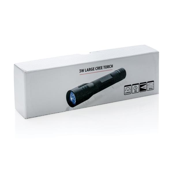 Latarka CREE 3W o bardzo jasnym świetle, wykonana z trwałego aluminium, 100 lumenów, czas pracy do 15 godzin, dzięki zastosowaniu diod CREE światło jest jaśniejsze niż w przypadku diod LED, ślad węglowy produktu: 2,82 kg CO2