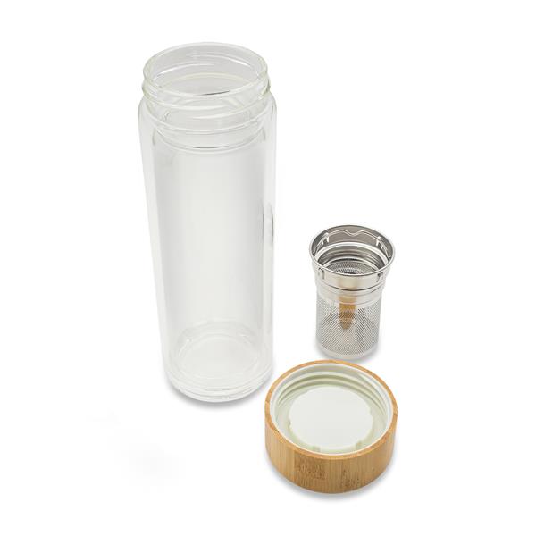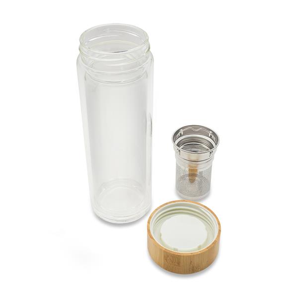 Butelka wykonana z borokrzemowego szkła o podwójnych ściankach, o pojemności 400 ml. Wyposażona w zaparzacz, który umożliwia łatwe przygotowanie ulubionych naparów i herbat. Bambusowa nakrętka nadaje jej naturalny, elegancki wygląd.