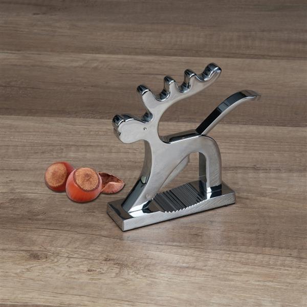 Nietypowy dziadek do orzechów w kształcie renifera, wykonany z aluminium.