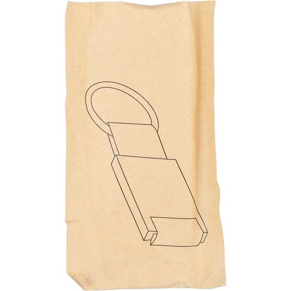 Metalowy brelok do kluczy z dżinsową zawieszką, zapakowany w rękaw papieru kraftowego