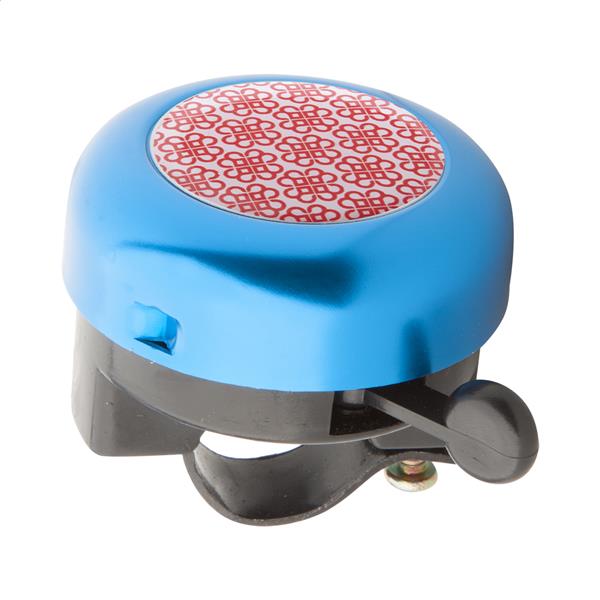 Aluminiowy dzwonek do roweru ze srebrną tabliczką.