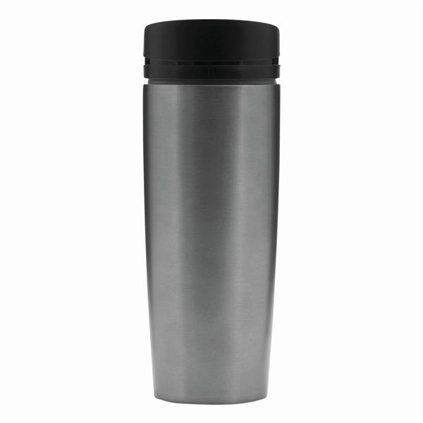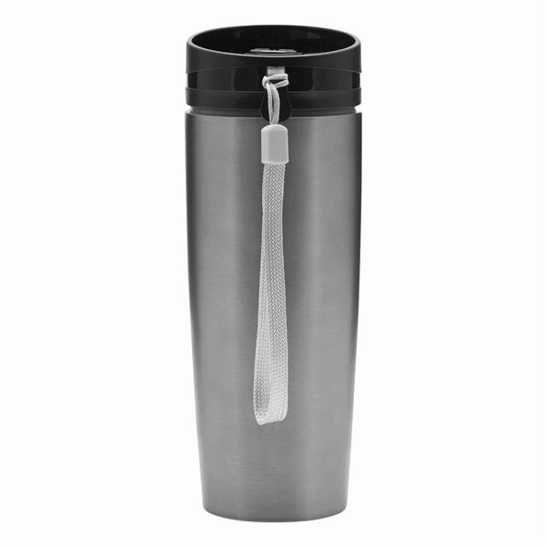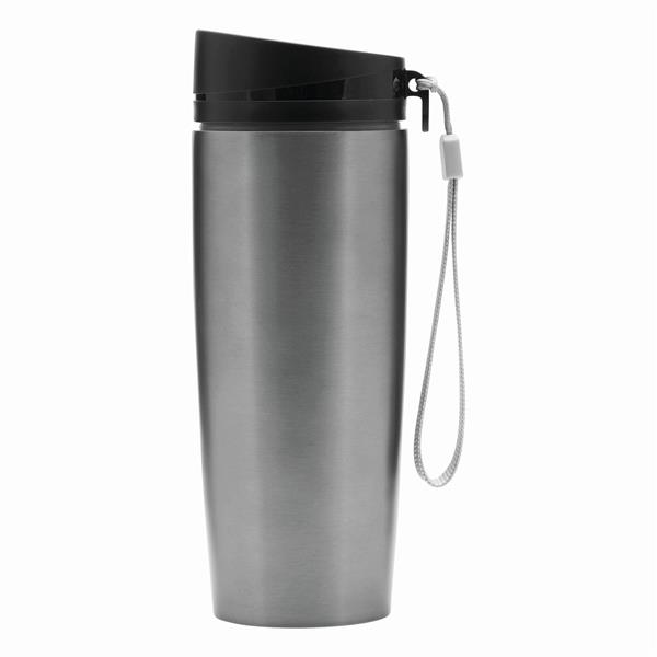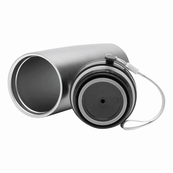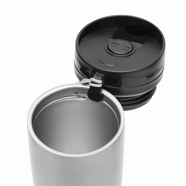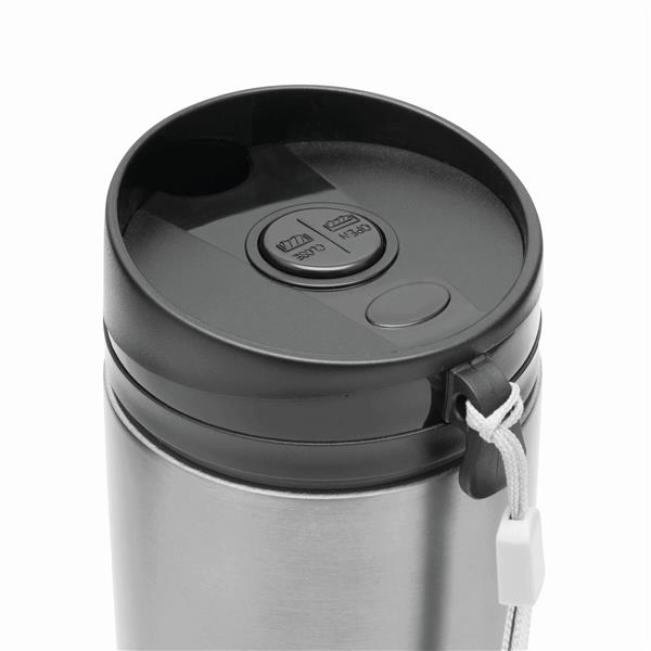 Kubek termiczny o podwójnych ściankach EARLY MORNING wewnątrz i na zewnątrz stal nierdzewna, plastikowe odkręcane wieczko z bezpieczną zakrętką, przyciskiem OPEN/CLOSE i otworem do picia, pojemność ok. 380 ml, z haczykiem do zawieszenia.