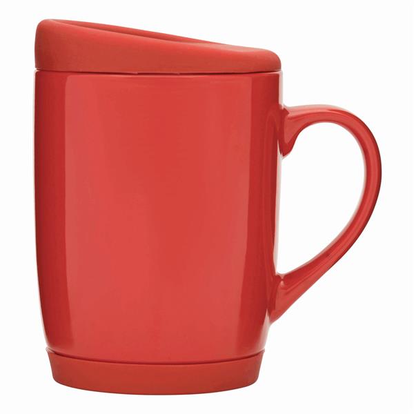 Kubek ceramiczny EASY DAY ze zdejmowaną, silikonową podstawką i silikonową pokrywką. Dobrze się trzyma. Pojemność ok. 350 ml. W białym pudełku.