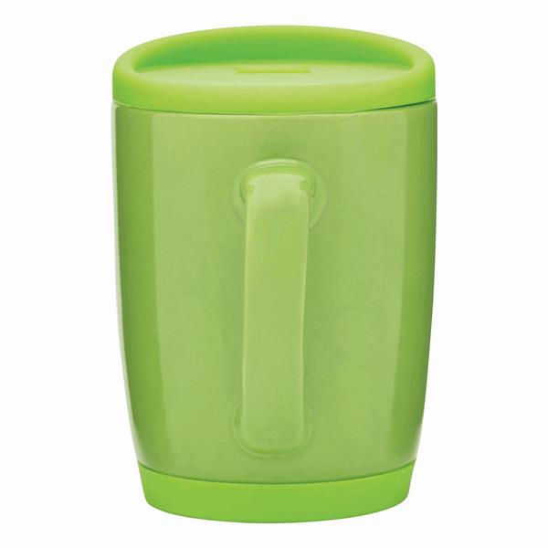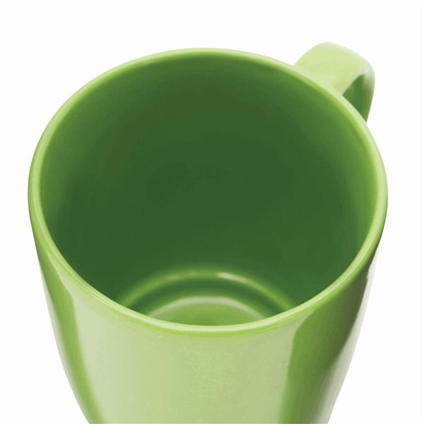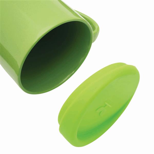 Kubek ceramiczny EASY DAY ze zdejmowaną, silikonową podstawką i silikonową pokrywką. Dobrze się trzyma. Pojemność ok. 350 ml. W białym pudełku.