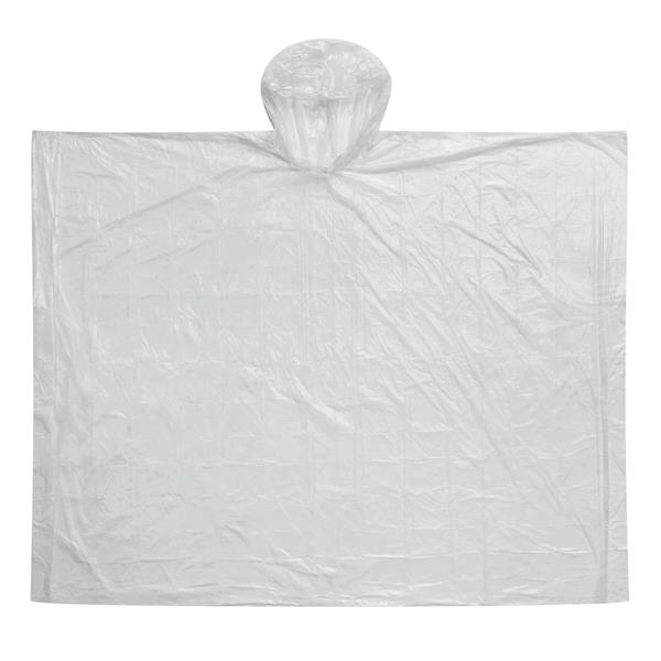 Poncho przeciwdeszczowe ECO SAFE: z kapturem, rozmiar uniwersalny, zapakowane w torbę RPET ze sznurkiem i karabińczykiem.