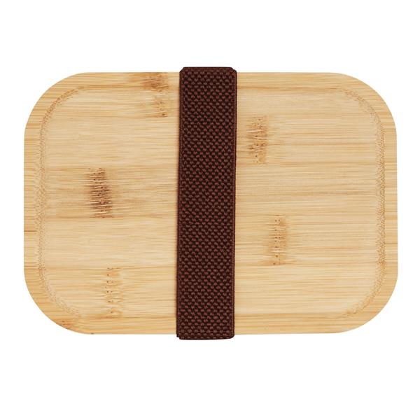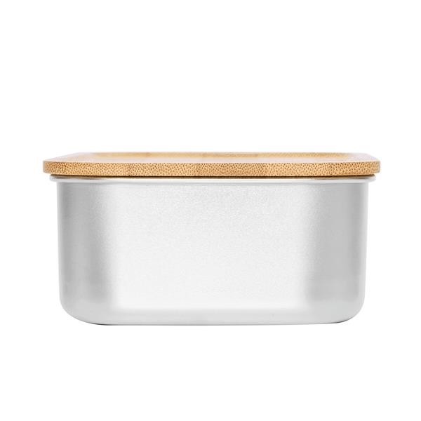 Pudełko śniadaniowe ECO TASTE ze stali nierdzewnej, z bambusowym wieczkiem. Widelec i nóż z bambusa umieszczone w dopasowanej opasce przytrzymującej pokrywkę pojemnika. Pojemność ok. 700 ml.