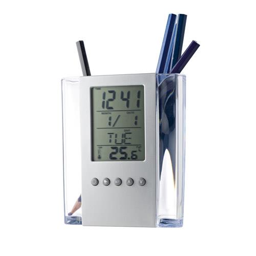 Wielofunkcyjny cyfrowy zegar biurkowy z uchwytem na długopisy. Najważniejsze cechy to duży ekran, alarm urodzinowy i możliwość odtwarzania 7 różnych melodii.Materiał: PS i akrylEkran: LCDFunkcje: zegar, kalendarz, alarm i termometrZawiera: 1 baterię CR2025W zestawie: białe pudełko prezentoweWymiary: 95 x 118 x 50 mm