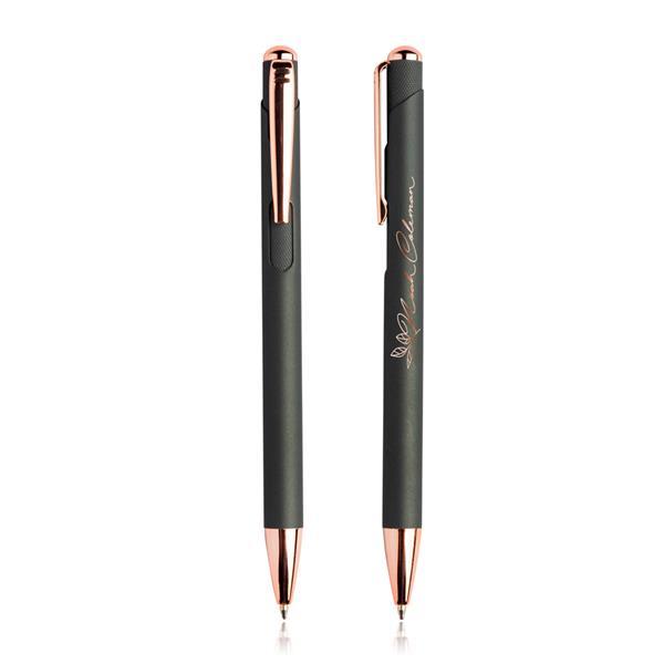 Nowoczesny zestaw piśmienniczy, składający się z długopisu oraz ołówka. Całość zapakowana w stylowe etui prezentowe z magnetycznym zamknięciem. Nasz zestaw to ponadczasowe połączenie designu z metalowymi detalami – całość sprawia, że nasz zestaw prezentuje się niezwykle elegancko. Dodatkowym atutem jest piękny, błyszczący grawer, który współgra z metalowymi elementami. Długopis posiada wkład piszący na niebiesko, a wraz z ołówkiem działają w systemie push.
