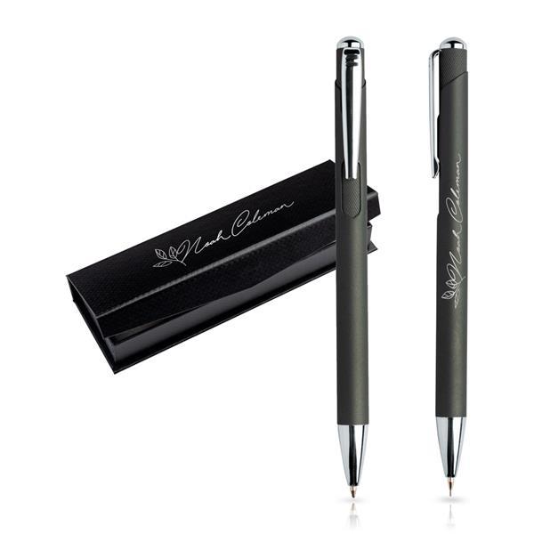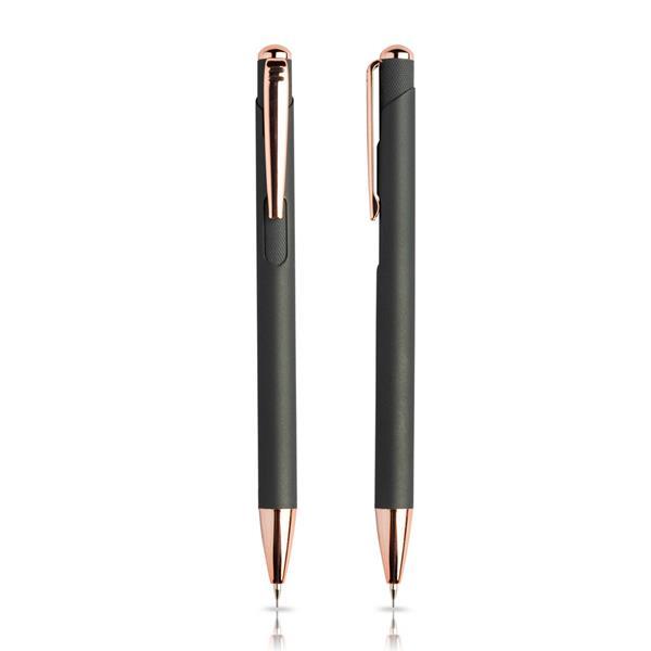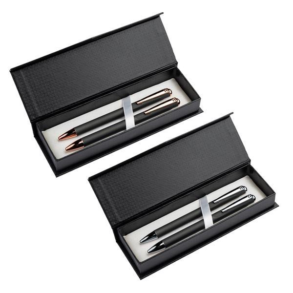 Nowoczesny zestaw piśmienniczy, składający się z długopisu oraz ołówka. Całość zapakowana w stylowe etui prezentowe z magnetycznym zamknięciem. Nasz zestaw to ponadczasowe połączenie designu z metalowymi detalami – całość sprawia, że nasz zestaw prezentuje się niezwykle elegancko. Dodatkowym atutem jest piękny, błyszczący grawer, który współgra z metalowymi elementami. Długopis posiada wkład piszący na niebiesko, a wraz z ołówkiem działają w systemie push.