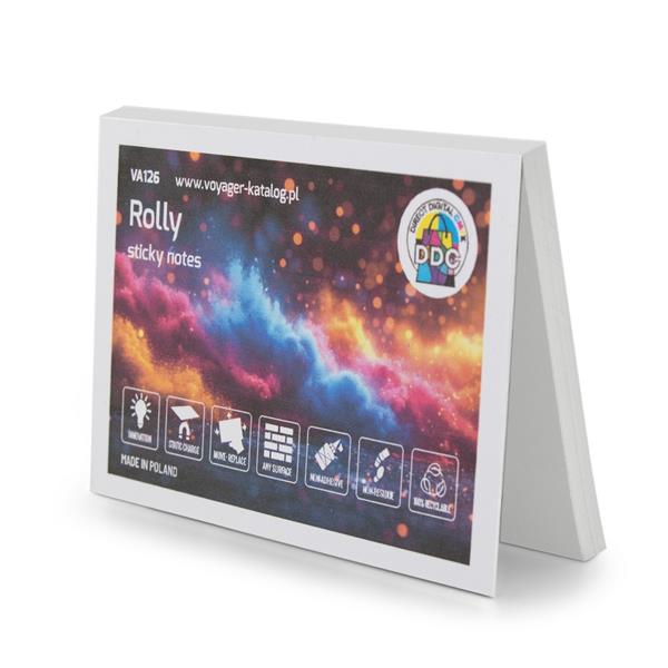 Karteczki samoprzylepne, przylegają do powierzchni za pomocą ładunku elektrostatycznego, dzięki czemu nie zostawiają śladów po kleju na powierzchniach, umożliwiają łatwą reorganizację notatek np. podczas szkoleń lub prezentacji, 100 szt., produkt wykonany z papieru oraz folii PP. Wyprodukowany w Europie.