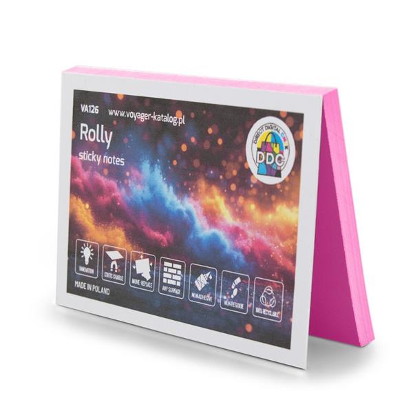 Karteczki samoprzylepne, przylegają do powierzchni za pomocą ładunku elektrostatycznego, dzięki czemu nie zostawiają śladów po kleju na powierzchniach, umożliwiają łatwą reorganizację notatek np. podczas szkoleń lub prezentacji, 100 szt., produkt wykonany z papieru oraz folii PP. Wyprodukowany w Europie.