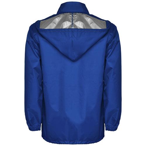 Wodoodporny płaszcz przeciwdeszczowy. Wysoki kołnierz i składany kaptur z regulowanym sznurkiem. Zamek błyskawiczny z przodu z dopasowanym ściągaczem. Dwie boczne kieszenie z klapką. Elastyczne mankiety. Elastyczny pasek wewnątrz kieszeni do składania i przechowywania. Model wodoodporny.