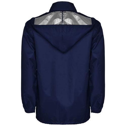Wodoodporny płaszcz przeciwdeszczowy. Wysoki kołnierz i składany kaptur z regulowanym sznurkiem. Zamek błyskawiczny z przodu z dopasowanym ściągaczem. Dwie boczne kieszenie z klapką. Elastyczne mankiety. Elastyczny pasek wewnątrz kieszeni do składania i przechowywania. Model wodoodporny.