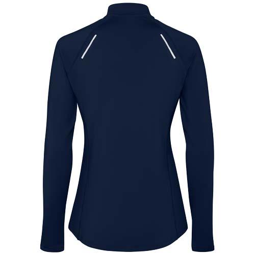 Damska techniczna bluza raglanowa z długim rękawem. Dopasowany krój. Kołnierz zapinany do połowy na zamek błyskawiczny z odblaskowymi detalami. Wzmocnione osłony szwów. Mankiety z otworami na kciuki. Odblaskowe detale na plecach. Tył nieco dłuższy niż przód. Ciepły, szczotkowany materiał wewnętrzny.